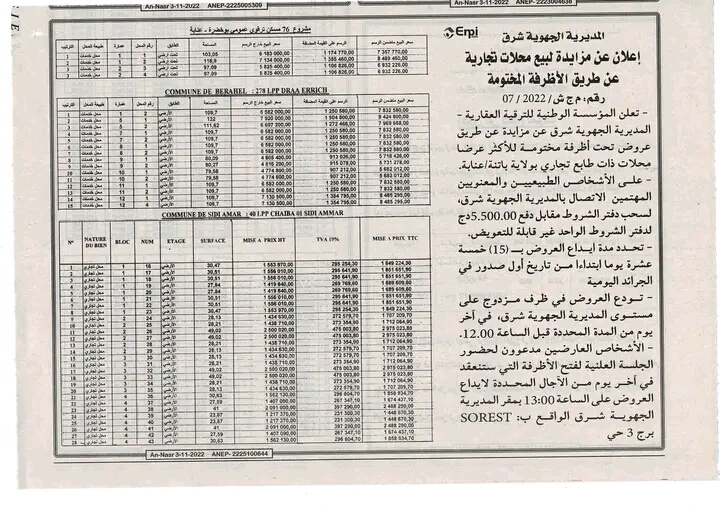 تعلن المؤسسة الوطنية للترقية العقارية المديرية الجهوية شرق(عنابة) عن بيع بالمزايدة في اظرفة مختومة محلات تجارية وخدمات برنامج الترقوي الحر والترقوي العمومي.